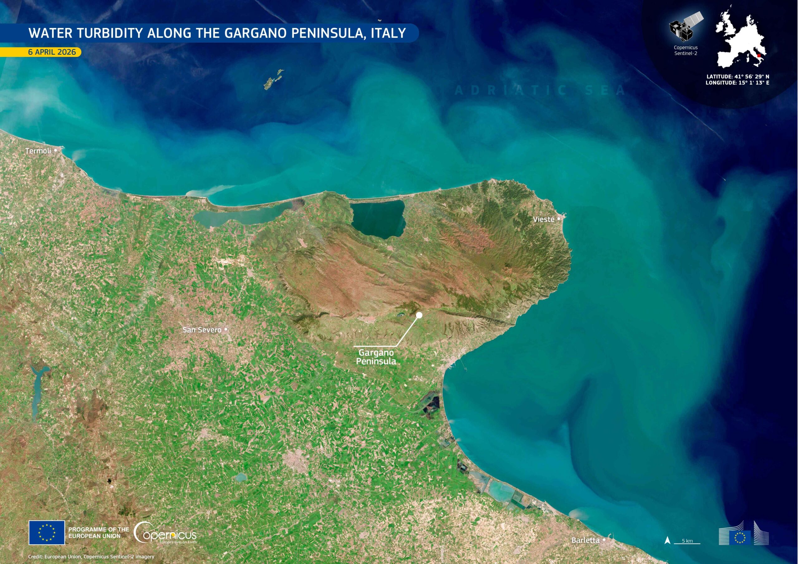 A seguito dell’alluvione di inizio Aprile 2026, questa immagine, acquisita il 6 aprile 2026 da uno dei satelliti Copernicus (Sentinel-2), mostra una elevata torbiditá dell’acqua lungo la linea di costa della zona del Gargano. Il deflusso carico di sedimenti dall’entroterra, ha raggiunto la costa, producendo pennacchi visibili che si estendono nel Mar Adriatico.