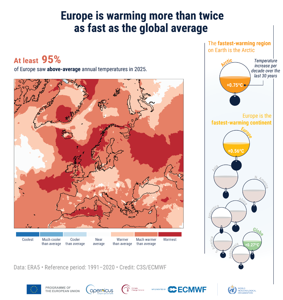 - Nel 2025 almeno il 95% dell’Europa ha registrato temperature annuali superiori alla media.